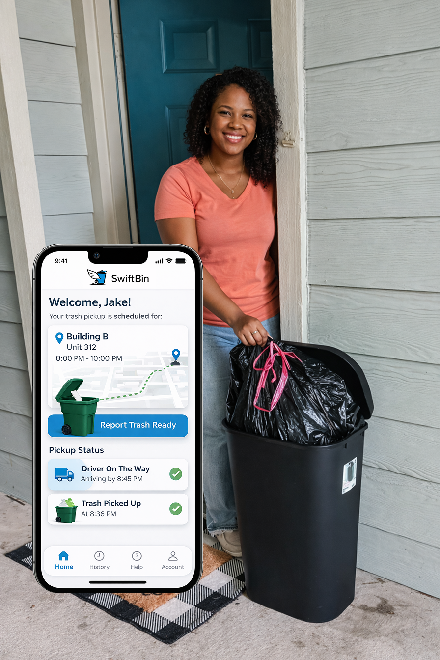 SwiftBin provides reliable, door-to-door valet trash service that is simple to implement, easy for residents to use, and creates new revenue with minimal operational effort.
